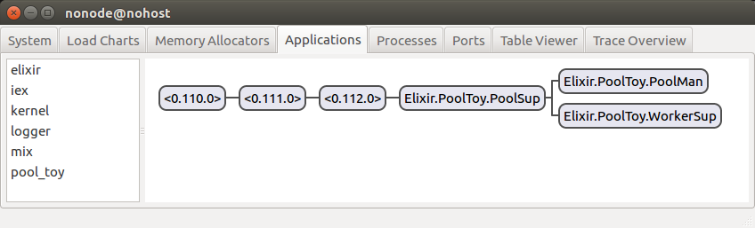 If you take this for a run in IEx and peek at the state for the PoolMan process, you’ll see we indeed have pids in the :workers state property, and that they match the ones visible in the application tab. Great!